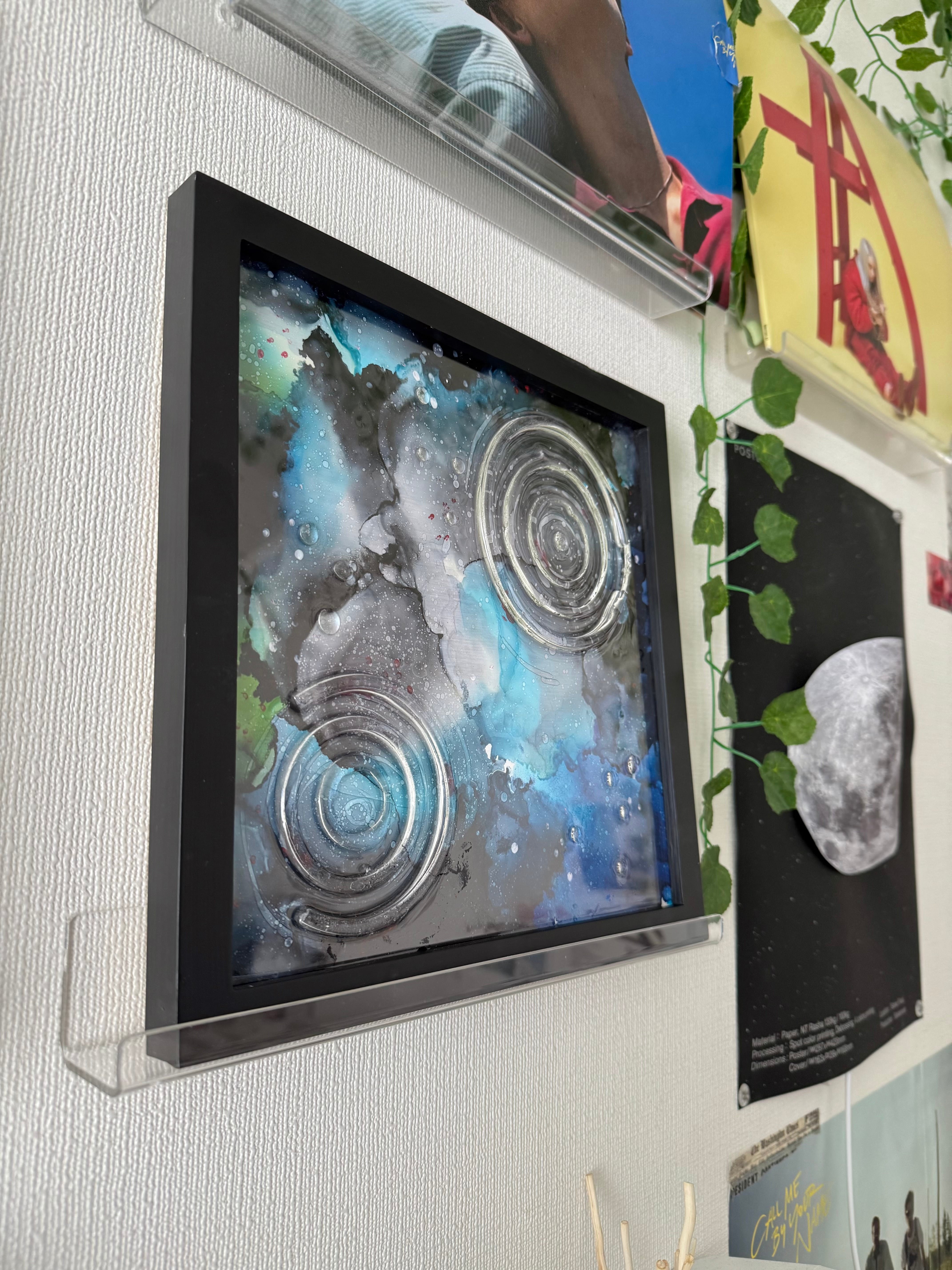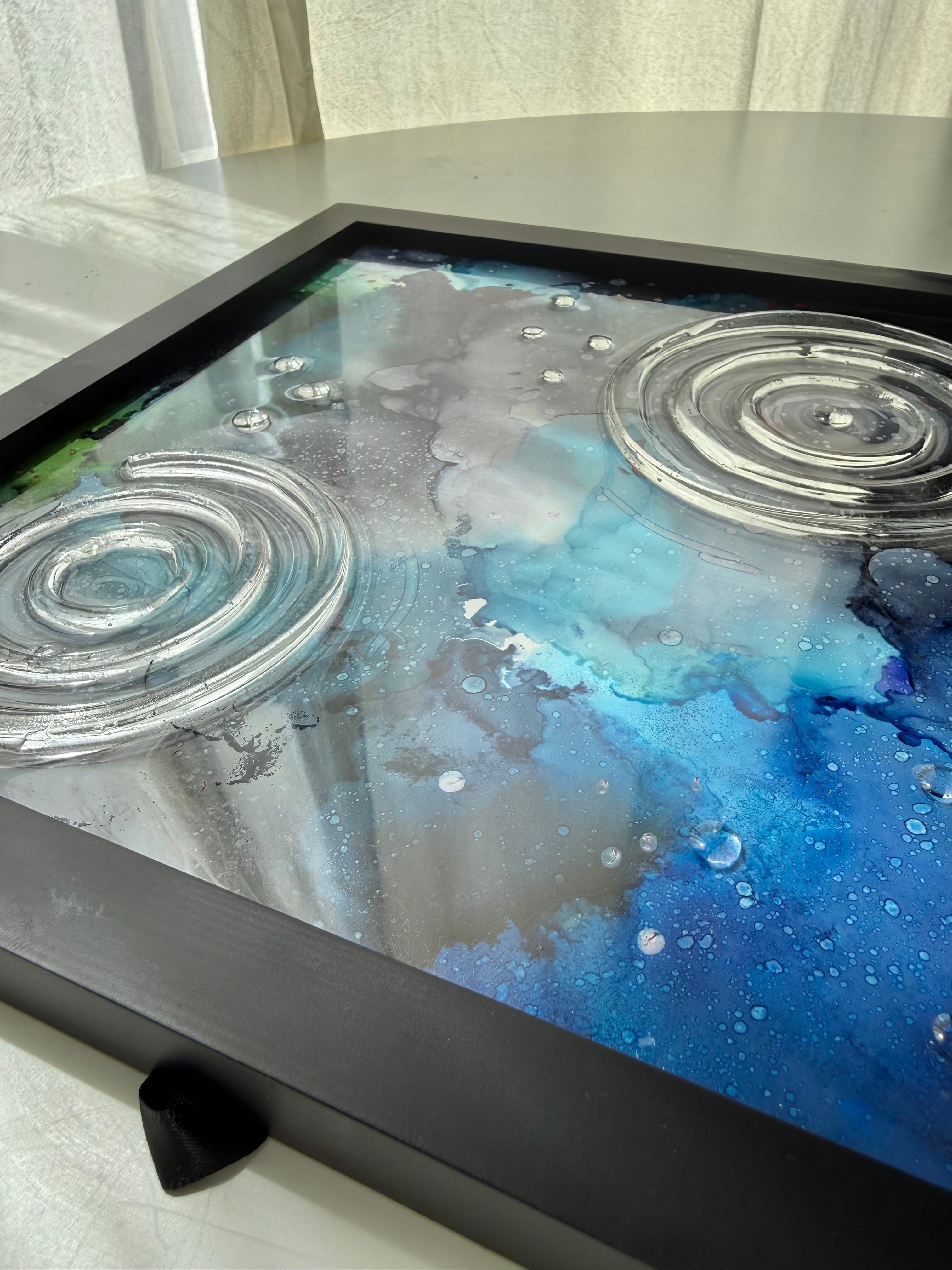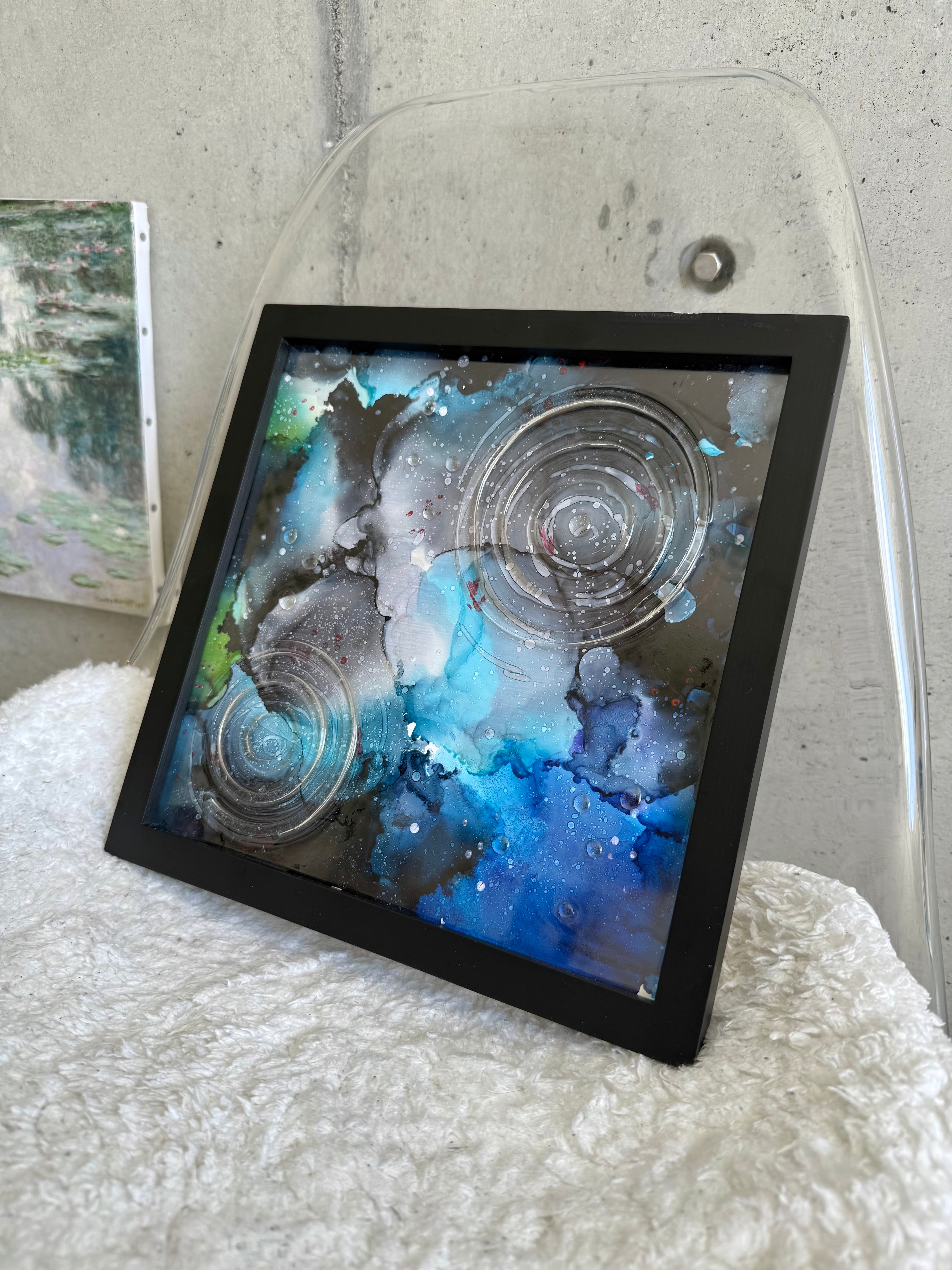 水の波紋は額縁の上から感じられるよう、透明板の上からレジンを垂らし作成しています。